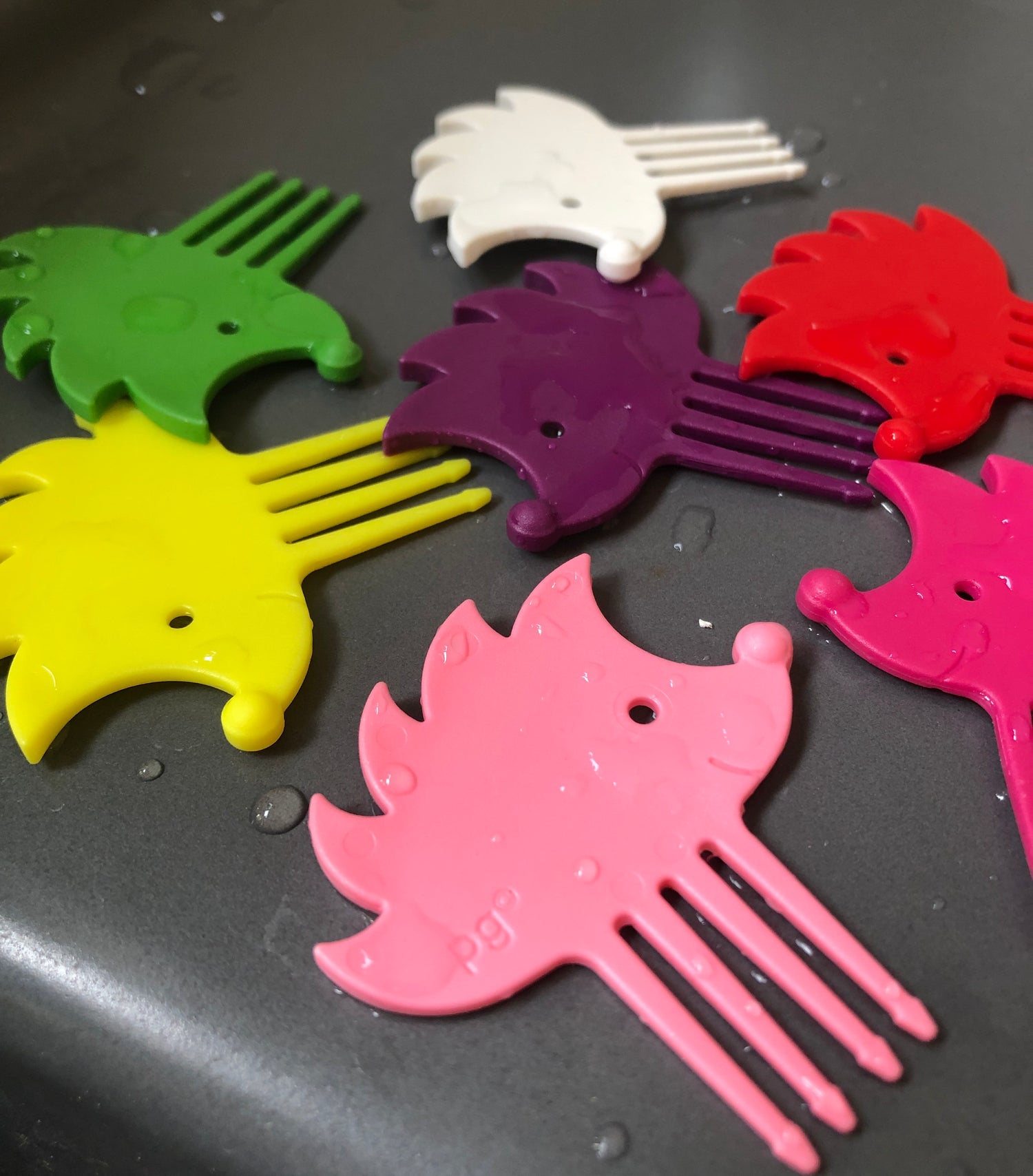 We also recommend not cleaning the snack picks in the same compartment with the metal cutlery, as this can lead to surface damage. Please always observe your dishwashers care instructions for plastic items.