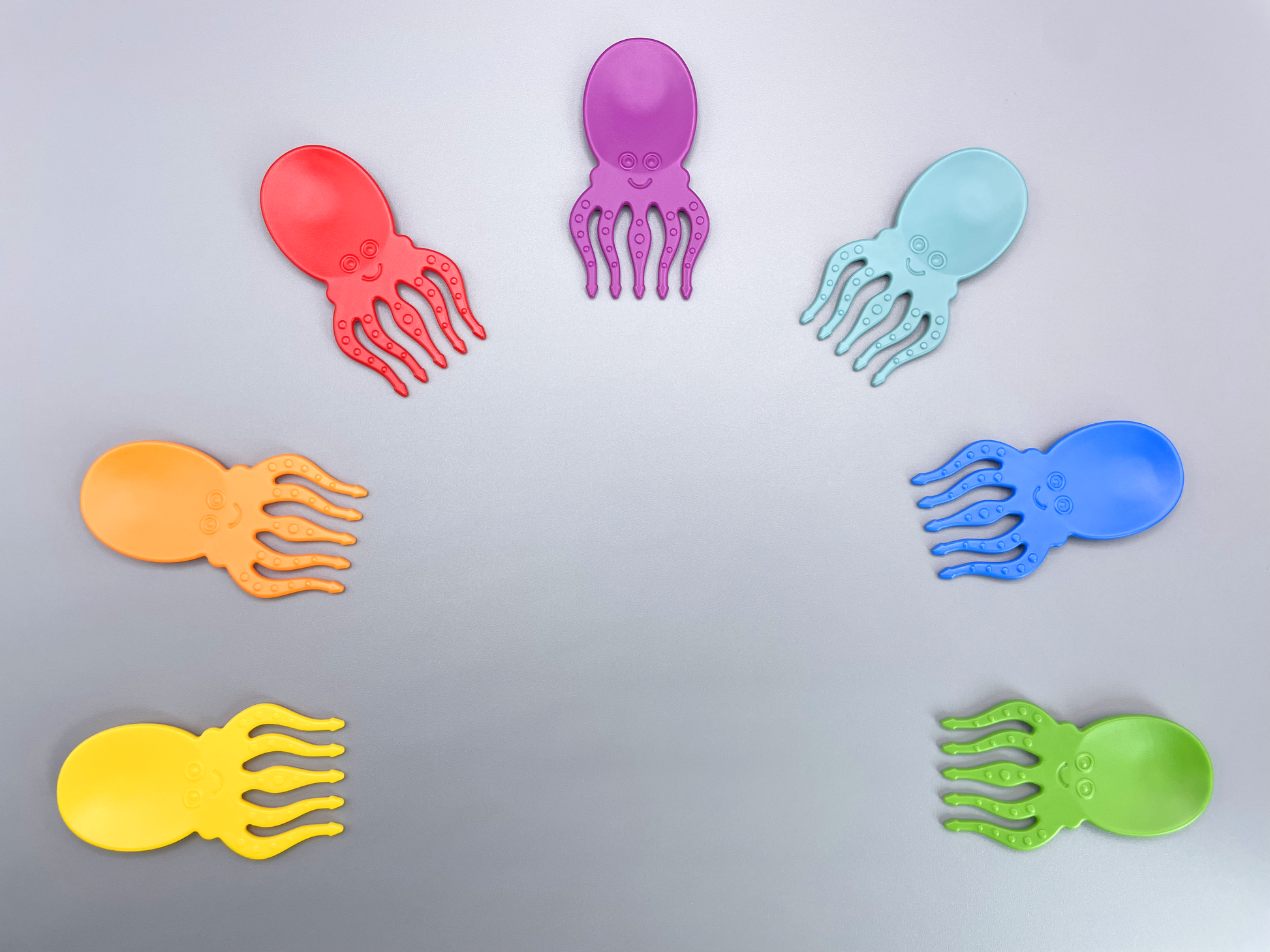 Die Farben des Regenbogens - aus dem Meer! Das "Ocean´s Seven"-Set beinhaltet 7 gleich große Pieksis (🐙 Tintenfisch) mit praktischer Pieks- und Snacklöffel-Funktion!